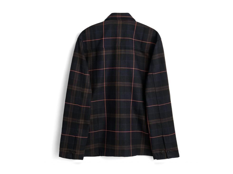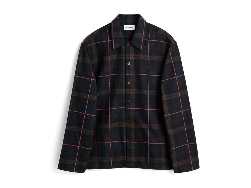 クラシックな襟とサイドポケットを備えた長袖シャツジャケット。